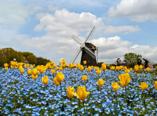 大阪市鶴見区にある「花博記念公園 鶴見緑地」は、1990年の花の万博の会場跡地に整備された約122ヘクタールの広大な公園です。山のエリアにある風車の丘の大花壇では、約14,000株のネモフィラがチューリップとともに咲き誇ります。オランダ風の大きな風車を背景に、青い花畑とカラフルなチューリップが並ぶ景色はまるで海外のよう。入園無料で終日開放されているので、散歩がてら気軽にふらっと立ち寄れるのもうれしいポイントです。