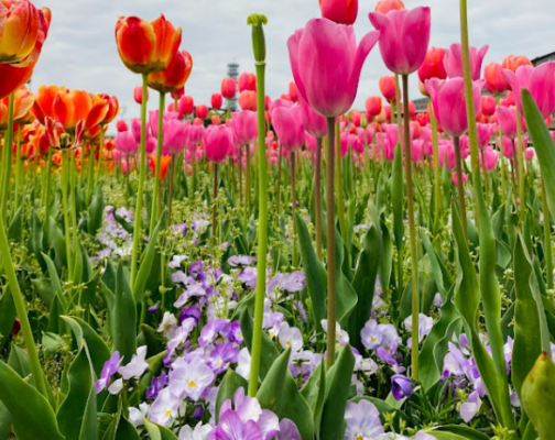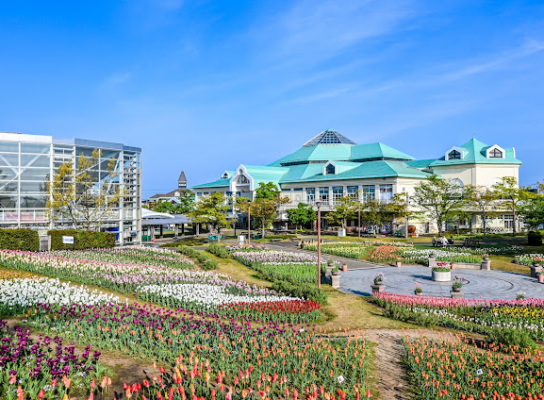 新潟市西区の国道8号沿いにある「道の駅 新潟ふるさと村」は、県下最大級の道の駅です。施設前の花畑では春に33品種約50,000本のチューリップが咲き誇り、その周辺でネモフィラも青い花を咲かせます。毎年デザインが変わるガーデンは写真映えも抜群。約10,000点の新潟土産が並ぶバザール館では地酒や笹団子も充実しているので、花を楽しんだあとの買い物やランチまでまとめて楽しめます。全天候型グリーンハウスには大型アスレチックもあり、雨の日でも子どもが遊べます。