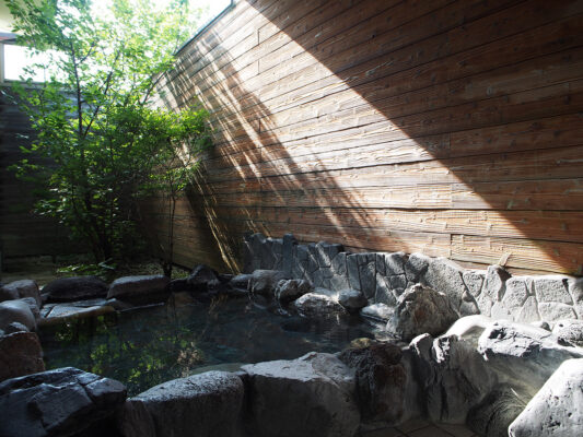 「氷見温泉郷 くつろぎの宿 うみあかり」の別館にある「潮の香亭」は、気軽に日帰り温泉が楽しめるスポットです。木造の素朴な湯屋に広がる天然岩風呂には、ナトリウム塩化物泉が源泉かけ流しで注がれていて、美肌の湯としても親しまれています。高張性の泉質は温泉成分を体に吸収しやすく、湯上がり後もぽかぽかが長続きするのがうれしいところ。本館の展望大浴場とは別の源泉なので、宿泊の方は2種類の湯巡りも楽しめます。