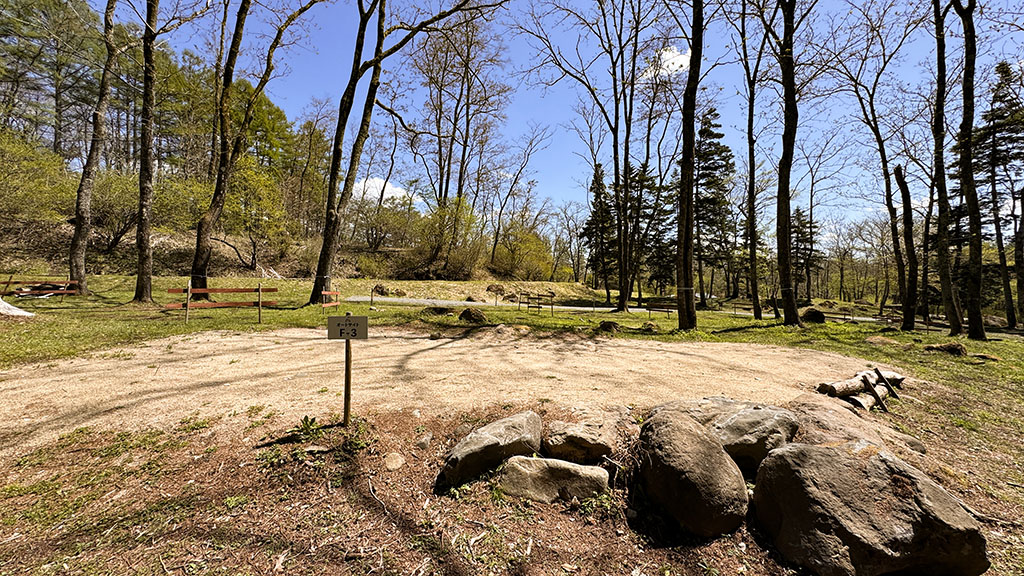 森側の区画は木の位置でレイアウトが変わります。大型幕は事前のサイズ確認がおすすめです。 - 地面
