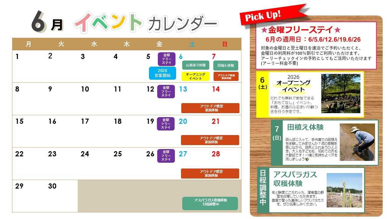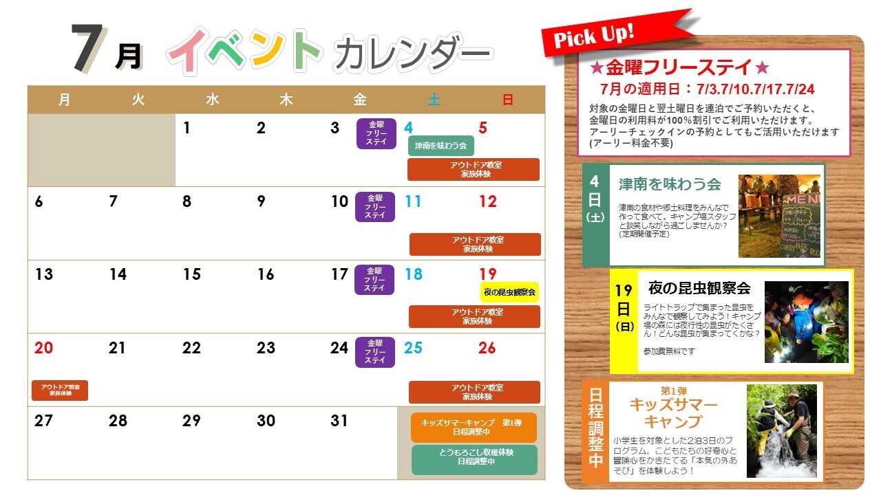 キャンプ場で開催予定のイベントのほかアウトドア教室・家族体験の開催日程についてまとめました。