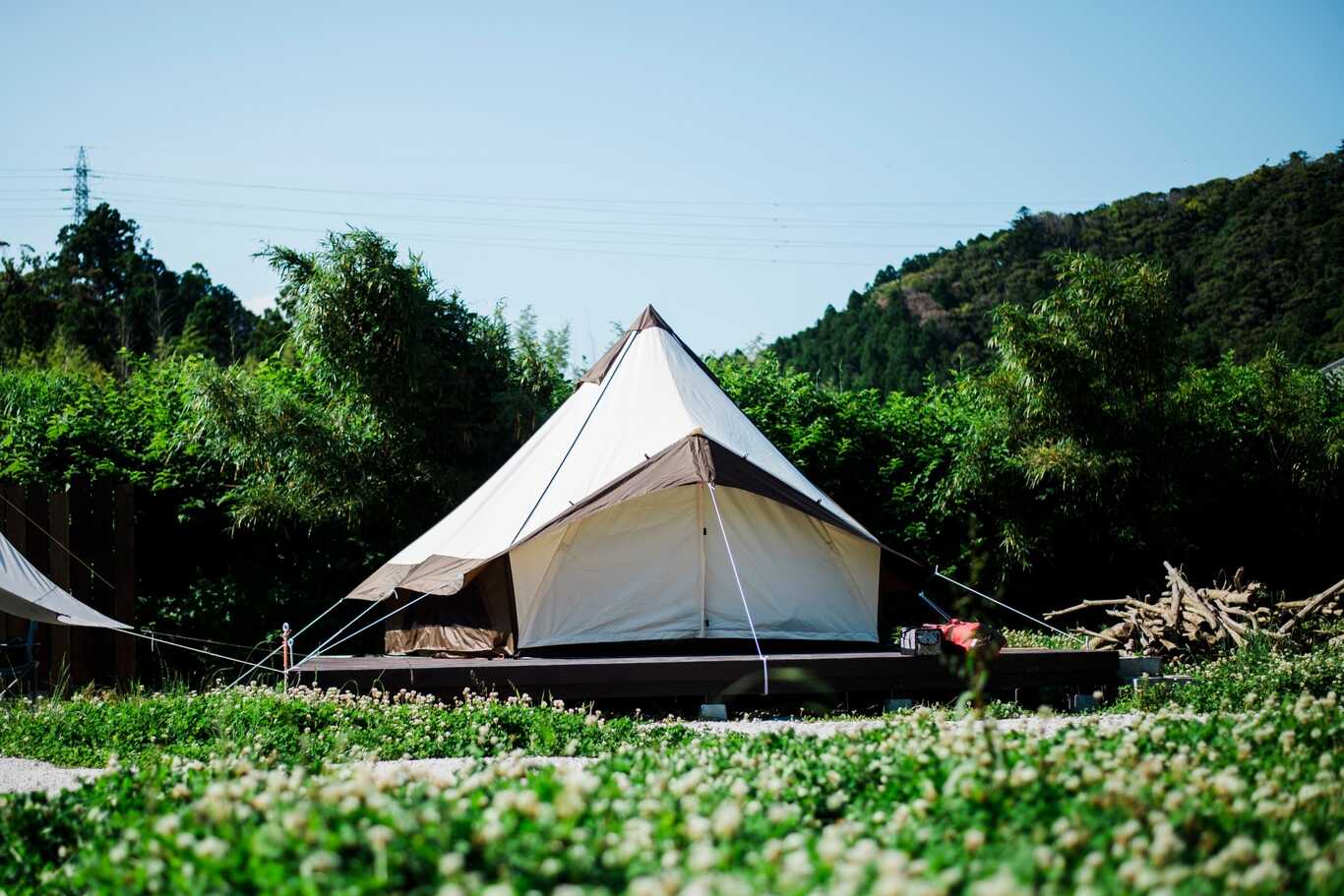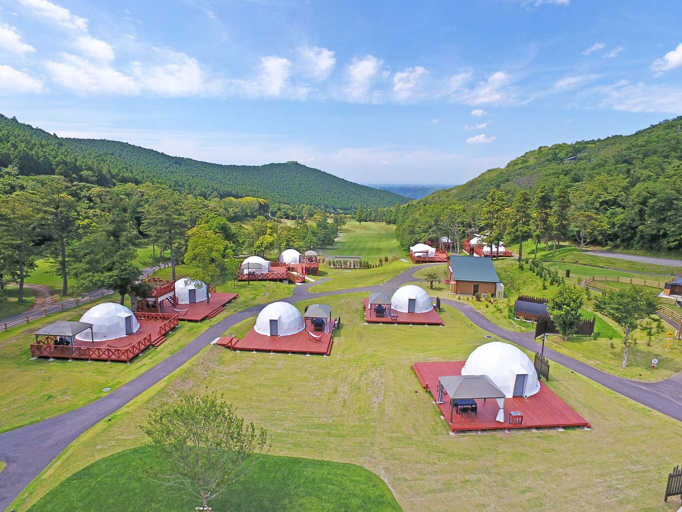 南房総の山並みの中に佇むグランピングエリアは、森の中の秘密基地。 鹿野山の雄大な自然の中で都会の喧騒から離れ、 ゴルフ場の中にある森と芝生の緑に囲まれたプライベート空間で 優雅な時間をお過ごしいただけます。