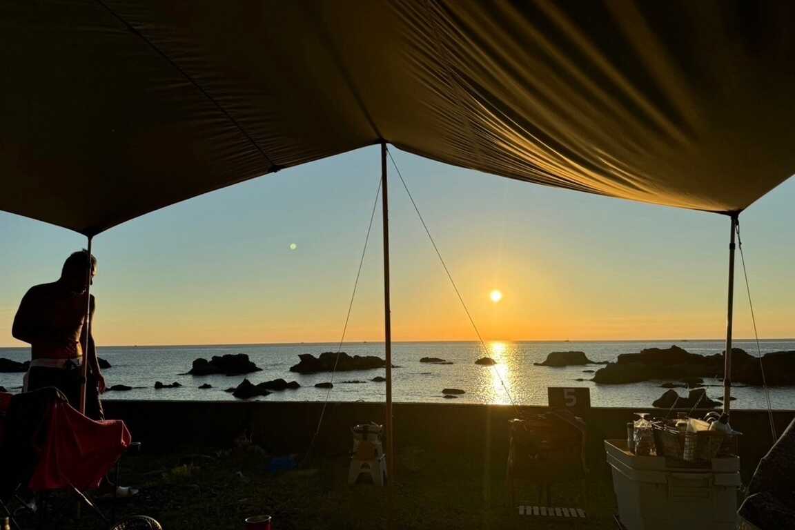 北緯36度、冬の北茨城市。 海の前という立地から海洋性の影響を受け、内陸部に比べて冷え込みにくい気候が特徴です。 澄んだ空気と静かな海、焚き火とともに過ごす冬のキャンプをお楽しみください。