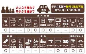 ●調理器具・食器・調味料・タオル類・スリッパはありません。必要な場合は各自お持ち下さい。