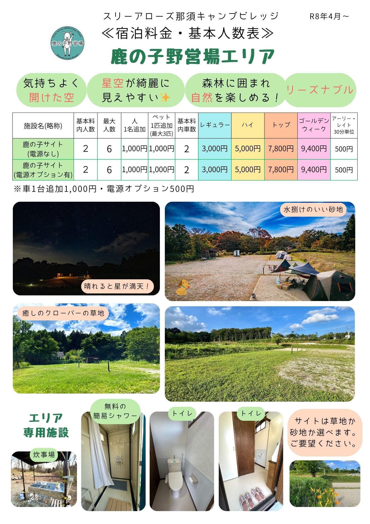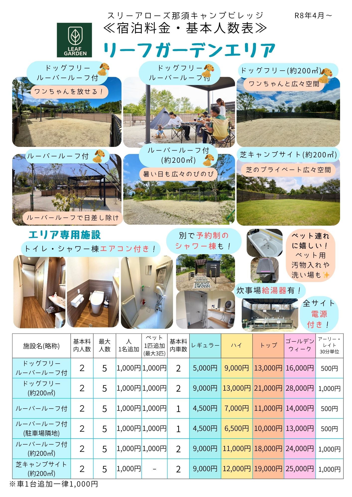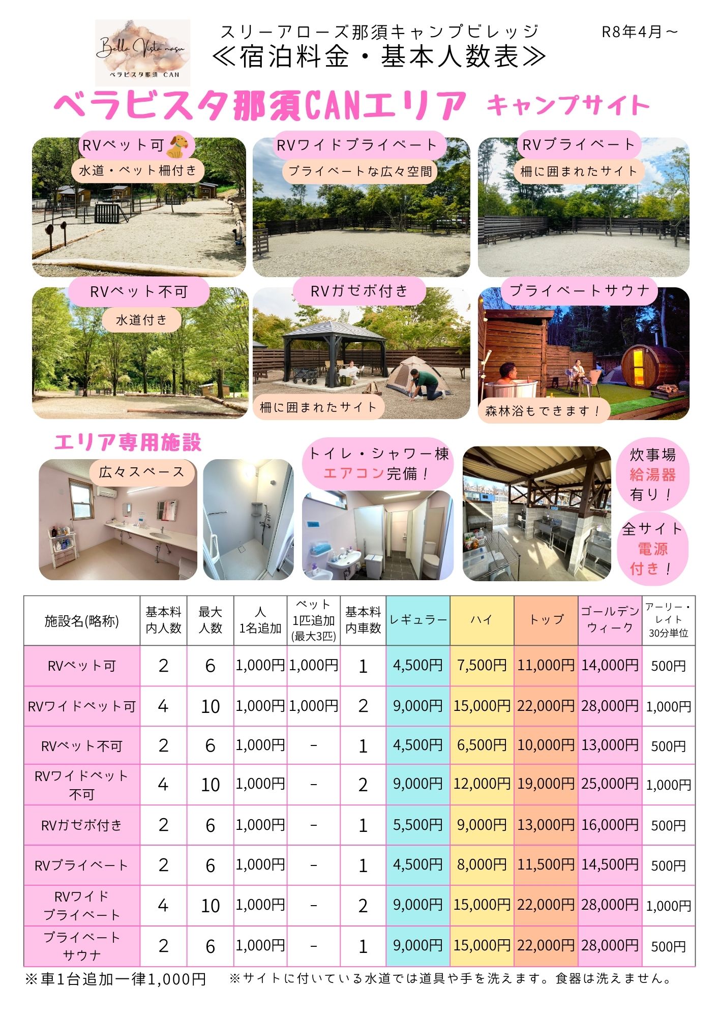 ▽サイト基本利用料 1サイト2名、車2台まで含む