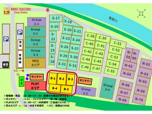 初心者向け_Bサイトは、サニタリー横の芝生の区画サイトになります。約110㎡の🚗乗入OKのオートサイトでペット連れでのご利用は不可となります。