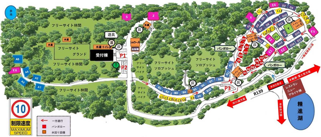 | 場内設備 | お風呂シャワーゴミ捨て場ランドリーウォッシュレット式トイレレストラン・食堂売店・自動販売機炊事棟給湯AC電源バリアフリー |