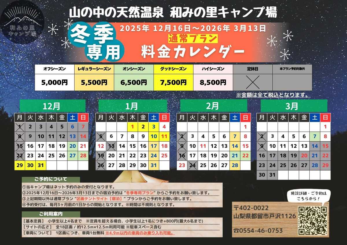 ●冬季は、サイト全体が日陰となりますので、防寒対策の準備をしてお越し下さいませ。